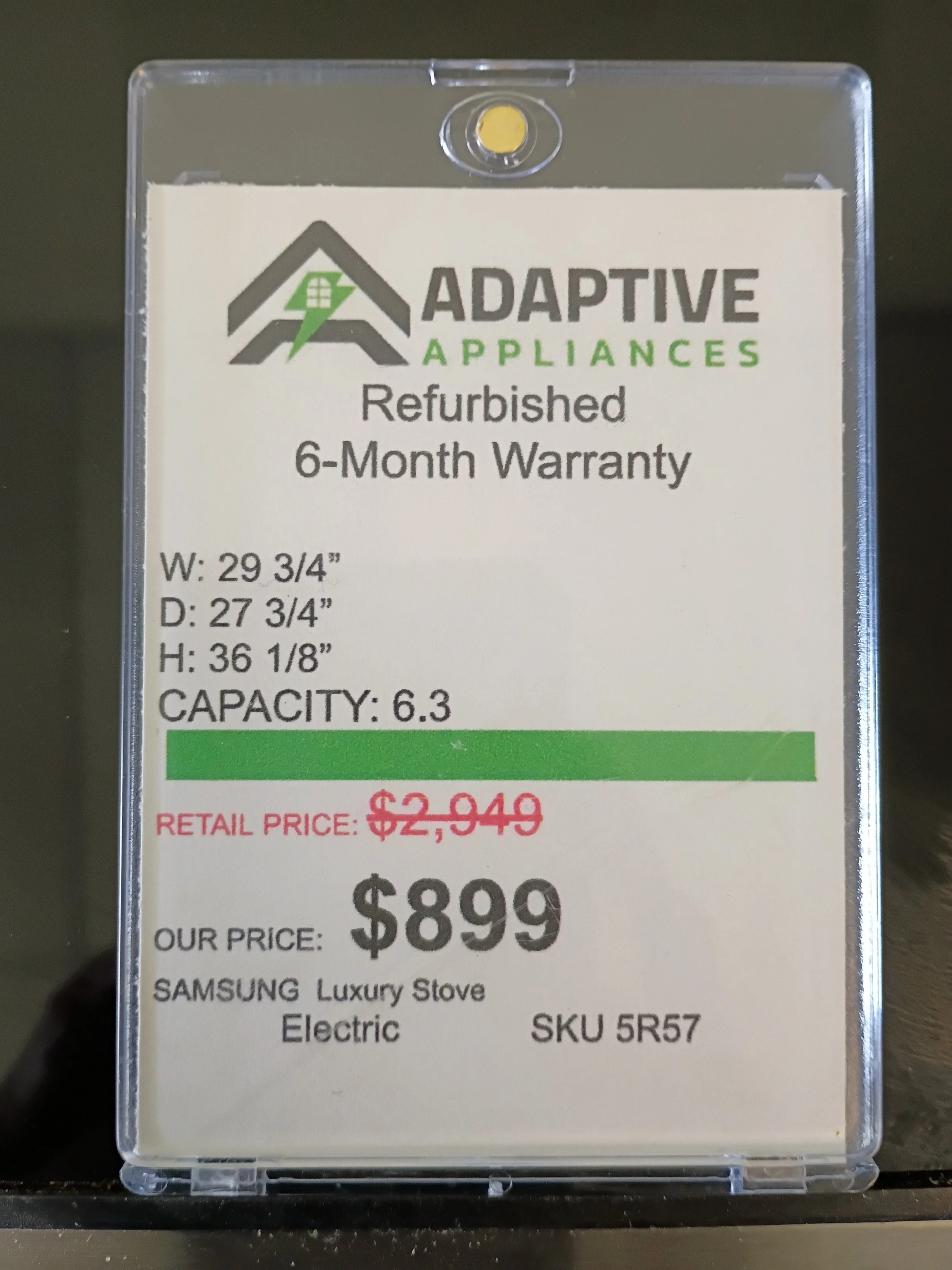 Inventory › Samsung Electric Range Image 1 of 5 Image 2 of 5 Image 3 of 5 Image 4 of 5 Image 5 of 5 Samsung Electric Range Sale Price: $899.00 Original Price: $2,949.00 Massive 6.3 cubic foot ovenEnergy efficient unitComes with a 6 month warranty Get notified by email when we have something similar in stock Purchase Added! Massive 6.3 cubic foot ovenEnergy efficient unitComes with a 6 month warranty You Might Also Like Quick View Frigidaire Electric Range Sale Price: $329.00 Original Price: $549.00 Sale